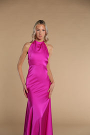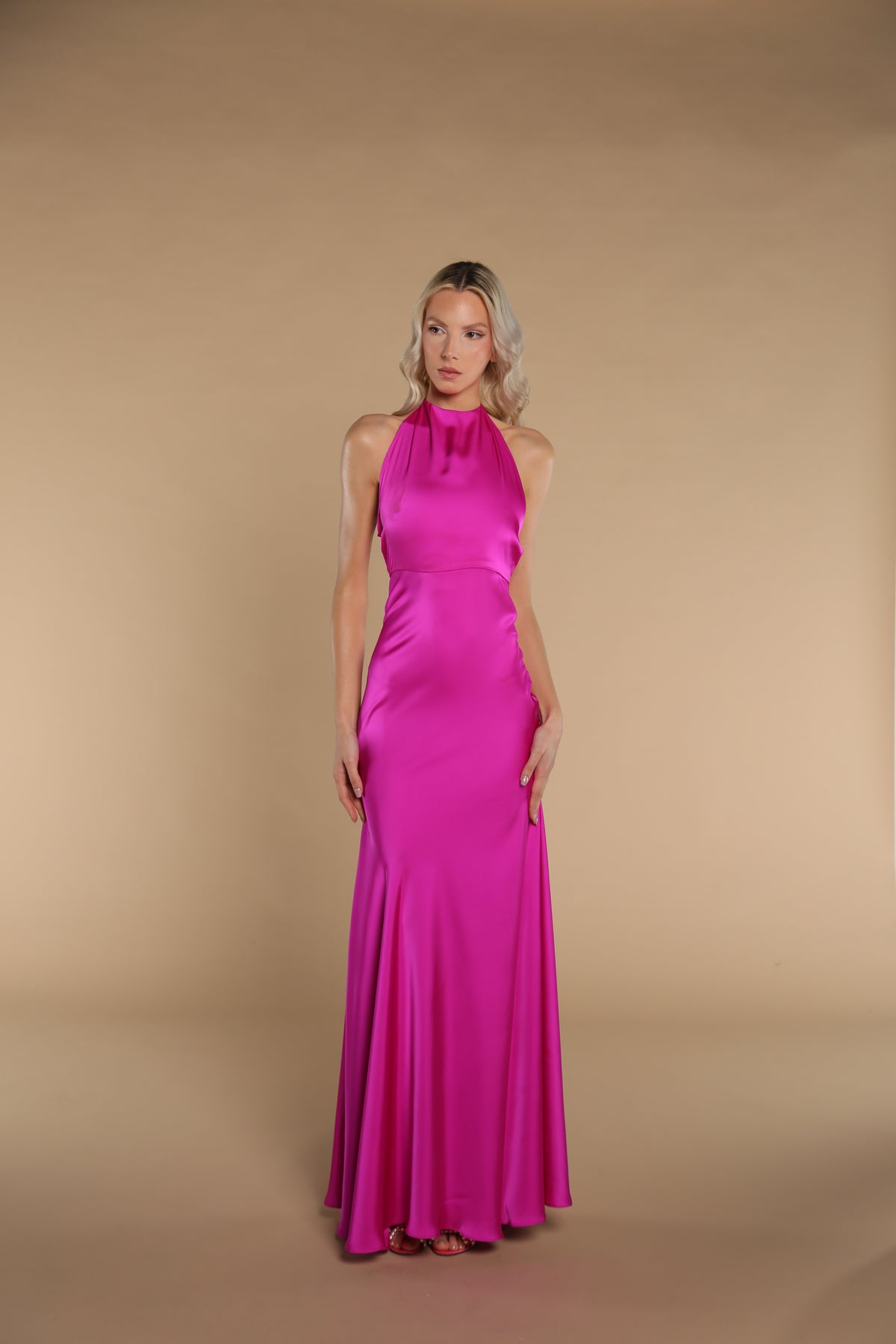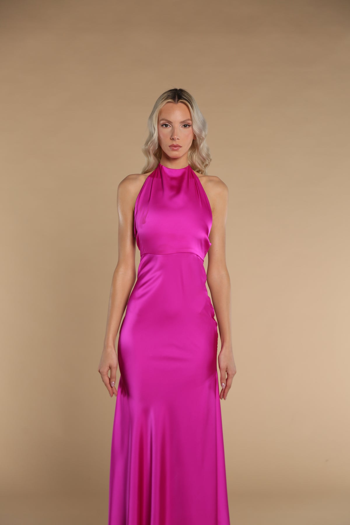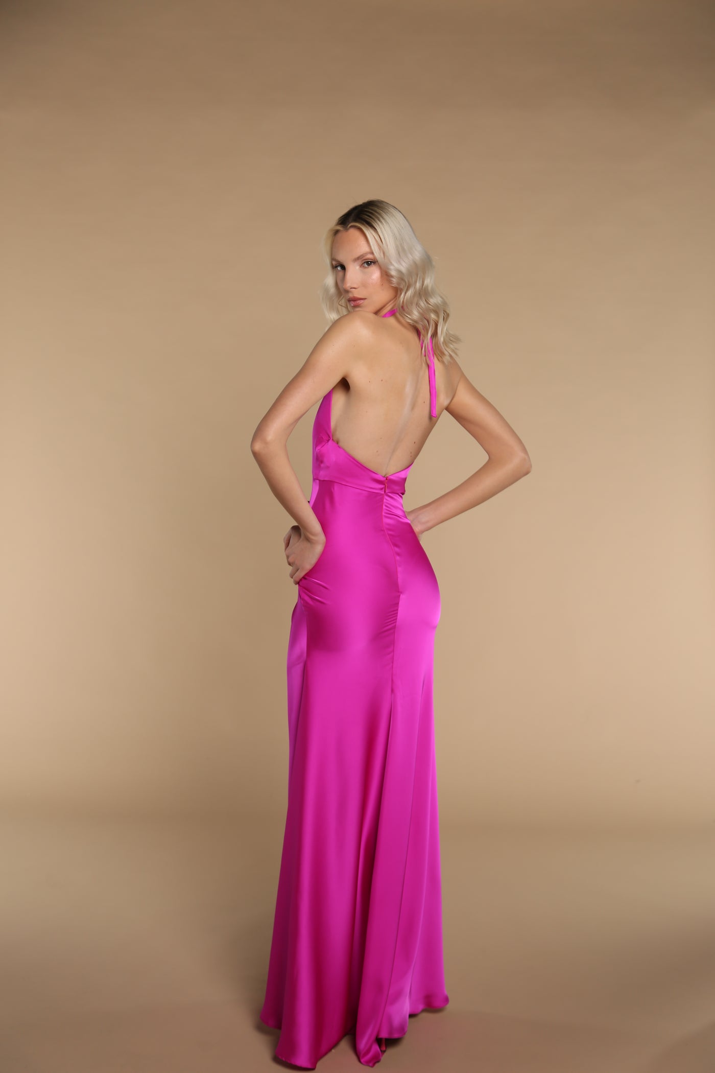 A floor-length gown in deep red pure silk, cut on the bias with a softly draped neckline and a striking low open back, designed to contour the body with smooth, elegant flow.