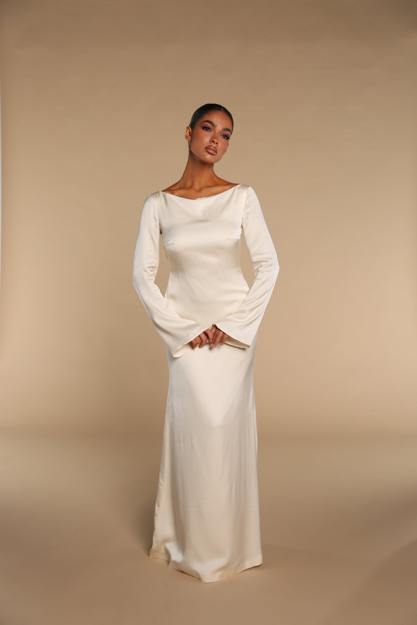 An elegant ivory silk gown with a clean, elongated silhouette, featuring a refined bateau neckline, softly flared long sleeves, and a fluid silk skirt that drapes effortlessly to the floor. Finished with a striking open back delicately tied at the neck, it balances timeless purity with modern, sculptural elegance.