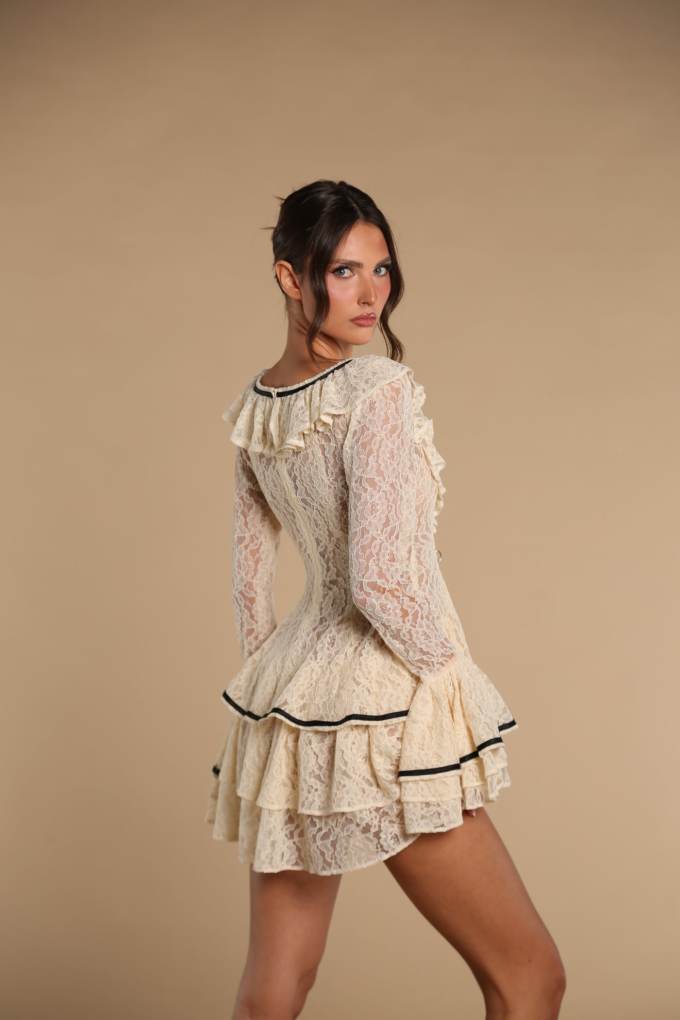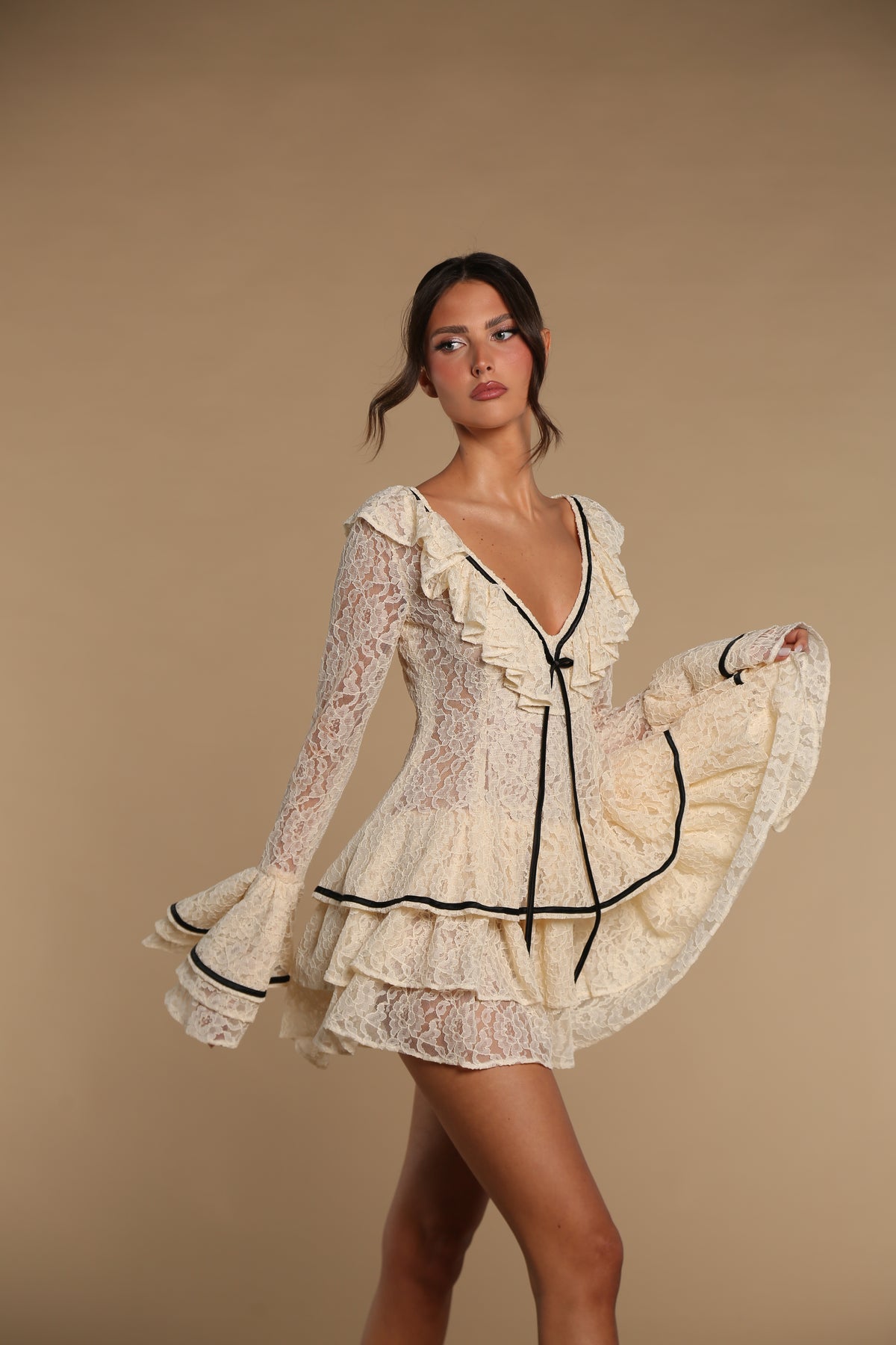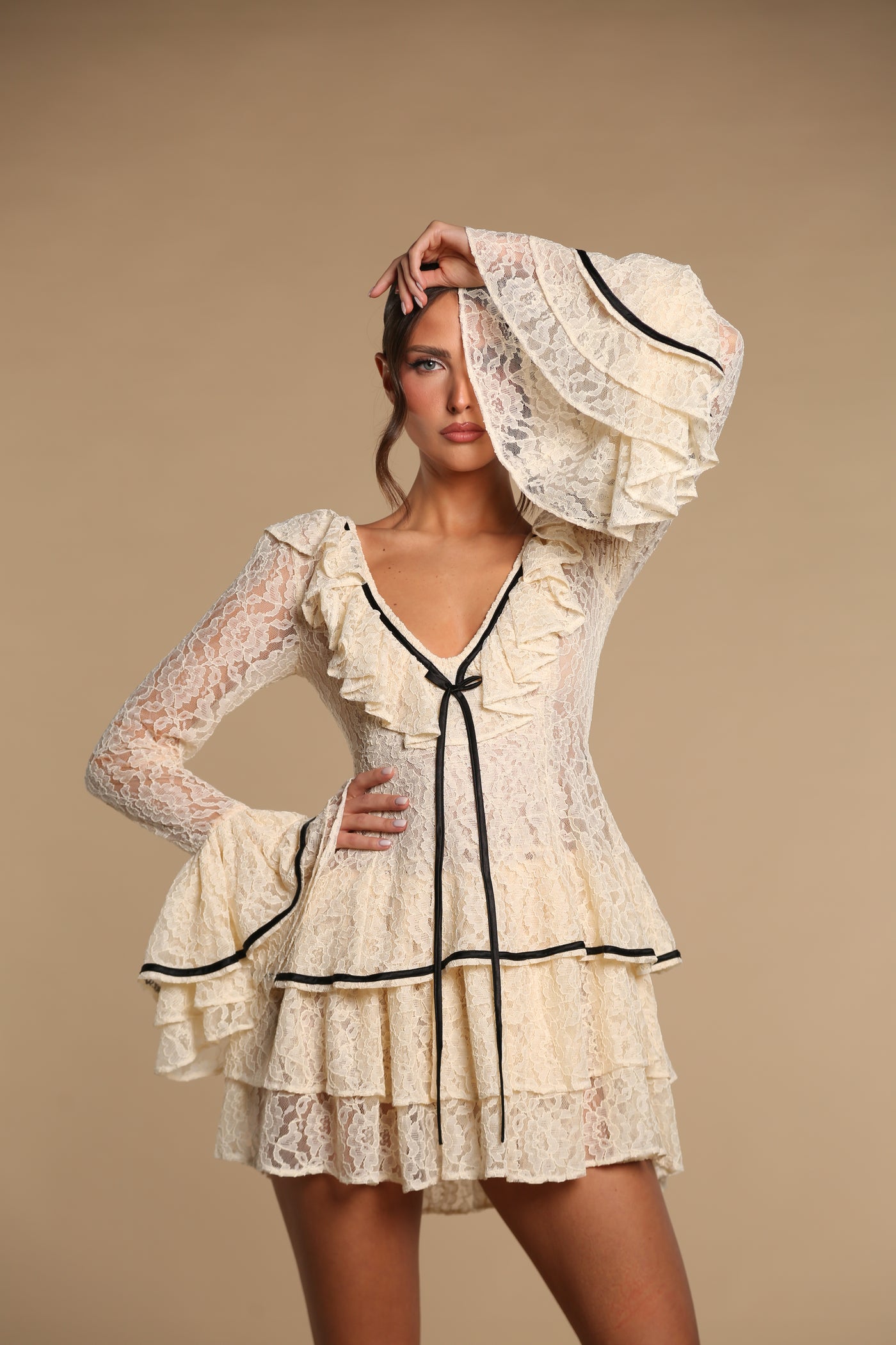 A fun, flirty, girly spring dress crafted in delicate lace with soft ruffles, featuring a flattering V-neckline, flowy flared sleeves, and a playful layered skirt that moves beautifully with every step.
