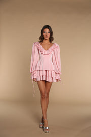 A soft pink, fun and flirty mini dress with romantic ruffle detailing, voluminous long sleeves, a flattering V-neckline, and a playful layered skirt that feels light, feminine, and perfect for spring.