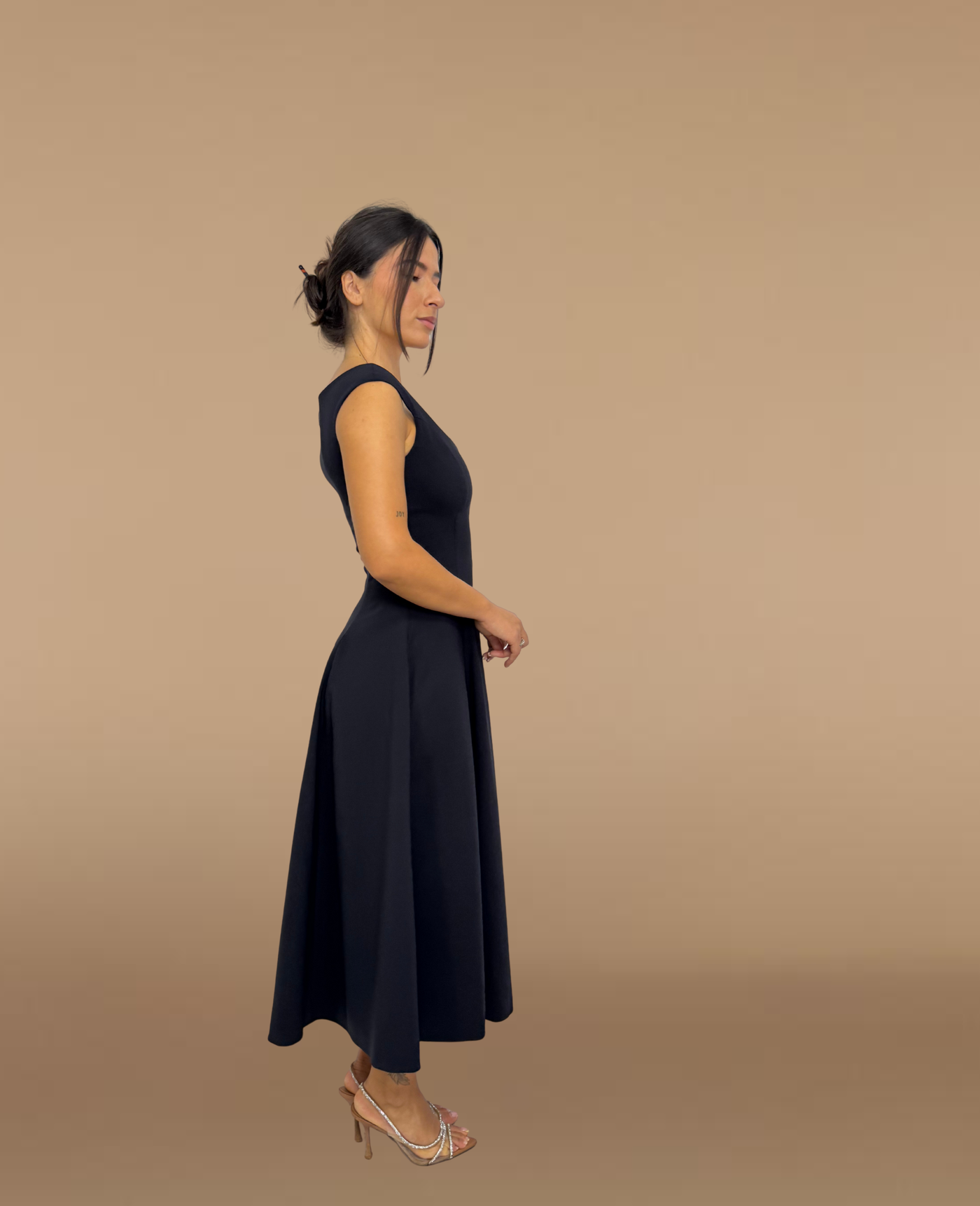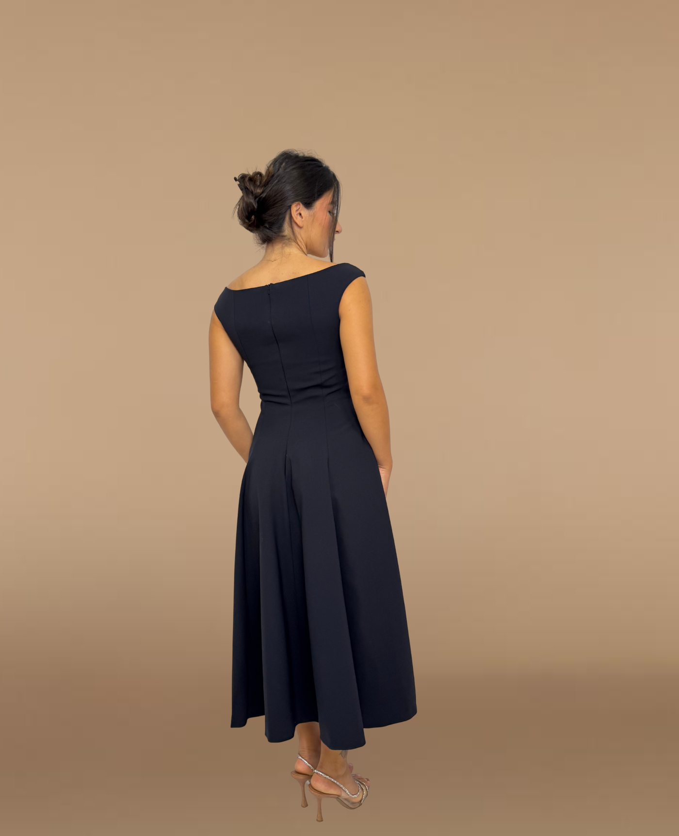 An effortlessly elegant black cotton-blend midi dress designed for winter sophistication. Featuring a soft scoop neckline, fitted bodice, and flowing A-line skirt, this piece blends comfort with timeless style. The breathable cotton-blend fabric ensures warmth without heaviness, making it a versatile choice for dinners, gatherings, or formal evenings.
